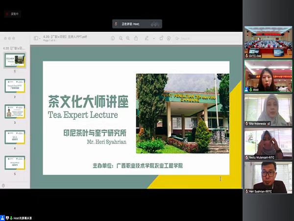 The speaker, Mr. Heri, is currently the director of R & D Department of Indonesia Research Institute for Tea and Cinchona, and has made great achievements in the field of plant breeding research. In the lecture, Mr. Heri comprehensively introduced the general situation of tea planting, tea plantation management, tea processing, tea export and Indonesian tea products in Indonesia around the theme of tea culture and tea industry, and fully demonstrated the development status and future development direction of Indonesian tea industry. Indonesia Research Institute for Tea and Cinchona is one of the eight national research institutes in Indonesia and a leader in the field of tea research and education in Indonesia. On January 12 this year, under the premise of mutual benefit and friendly cooperation between our college and Indonesia Research Institute for Tea and Cinchona, we jointly established the Indonesian Silk Road Tea Institute of Guangxi Vocational and Technical College. This lecture is an academic exchange activity between the two sides carried out under the cooperation framework of the construction of Silk Road Tea Institute. It aims to jointly promote the exchange and integration of regional tea education and lay the foundation for the next cooperation of production, education and research projects between the two sides.