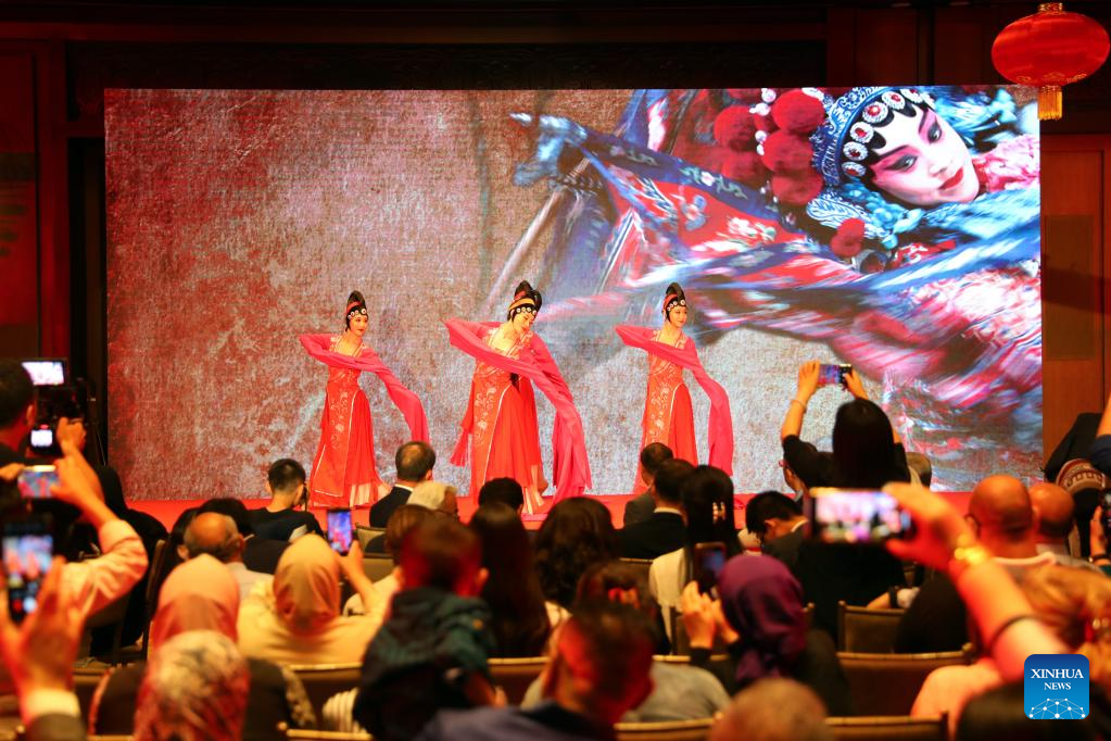 People watch traditional Chinese dance performance at a Chinese tea culture event in Cairo, Egypt, on May 25, 2023. A tea-themed cultural salon was held on Thursday in the Egyptian capital of Cairo, with more than 200 people gathering to taste famous Chinese tea, experience tea-making art, and enjoy cultural performances. [Photo/Xinhua]