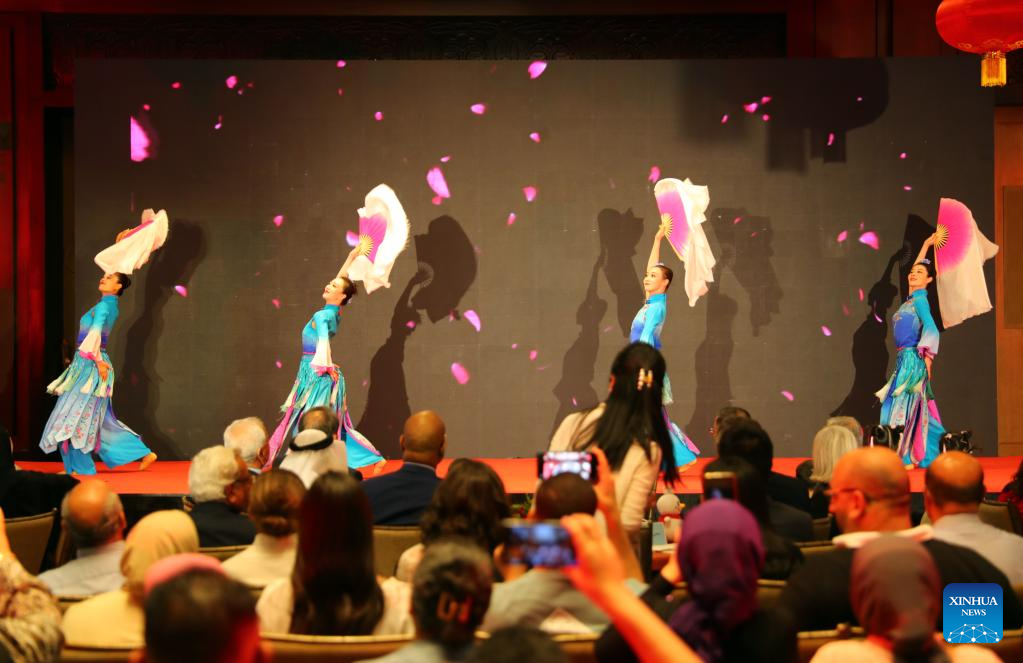 People watch traditional Chinese dance performance at a Chinese tea culture event in Cairo, Egypt, on May 25, 2023. A tea-themed cultural salon was held on Thursday in the Egyptian capital of Cairo, with more than 200 people gathering to taste famous Chinese tea, experience tea-making art, and enjoy cultural performances. [Photo/Xinhua]