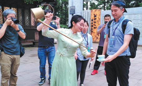Wang Fei, a master of the traditional Mengshan tea-serving techniques, participates in more than 10 overseas cultural exchange activities each year to showcase her tea-serving skills and promote Mengshan tea and its culture.